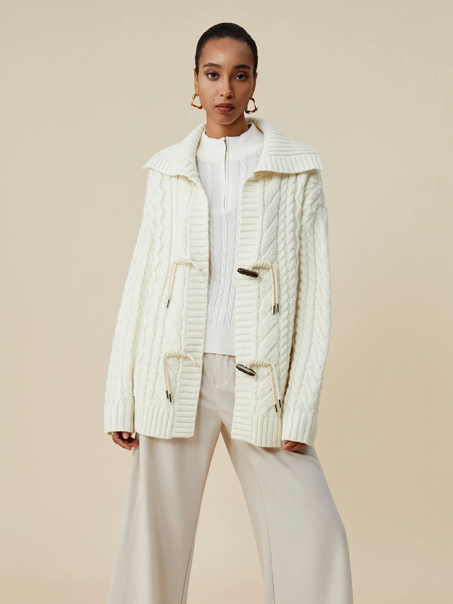%100 premium yün ipliğinden üretilen bu hırka, yumuşak ve kabarık dokusuyla konfor ve esneklik sunar; lüks ve yüksek kaliteli bir his yaratır.
