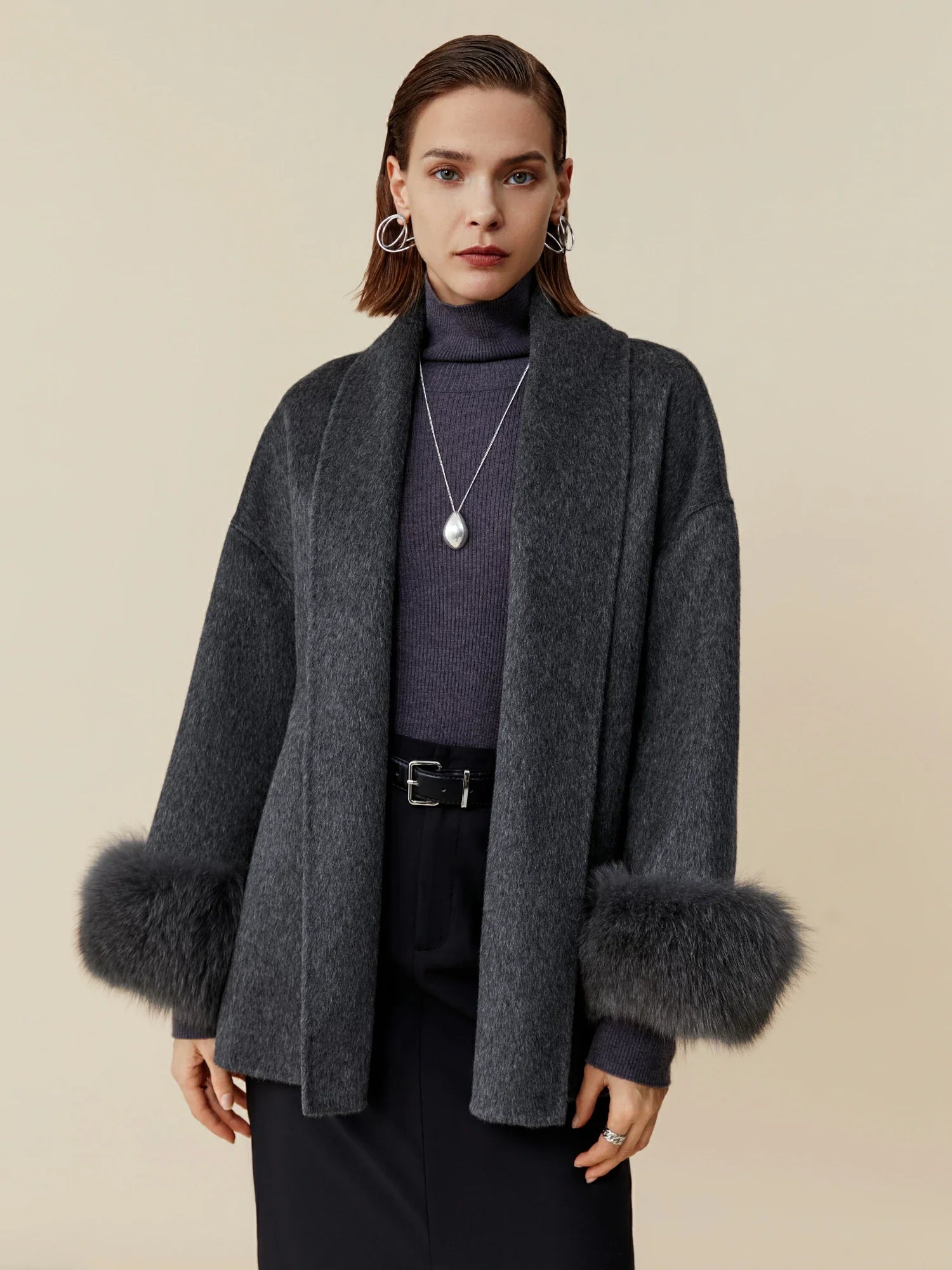 Mandarin yaka zarif bir dokunuş katarken, kısa kesim ve bol oturuş şık ve vücuda uygun bir siluet yaratır. Çıkarılabilir gerçek tilki kürkü kolluklar lüksü artırır, düşen omuz tasarımı ise modaya uygun bir hava katar.